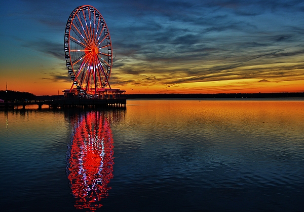 Landmark Ferris Wheel at National Harbor across from Washington, D. C. is reflected in the Potomac River.